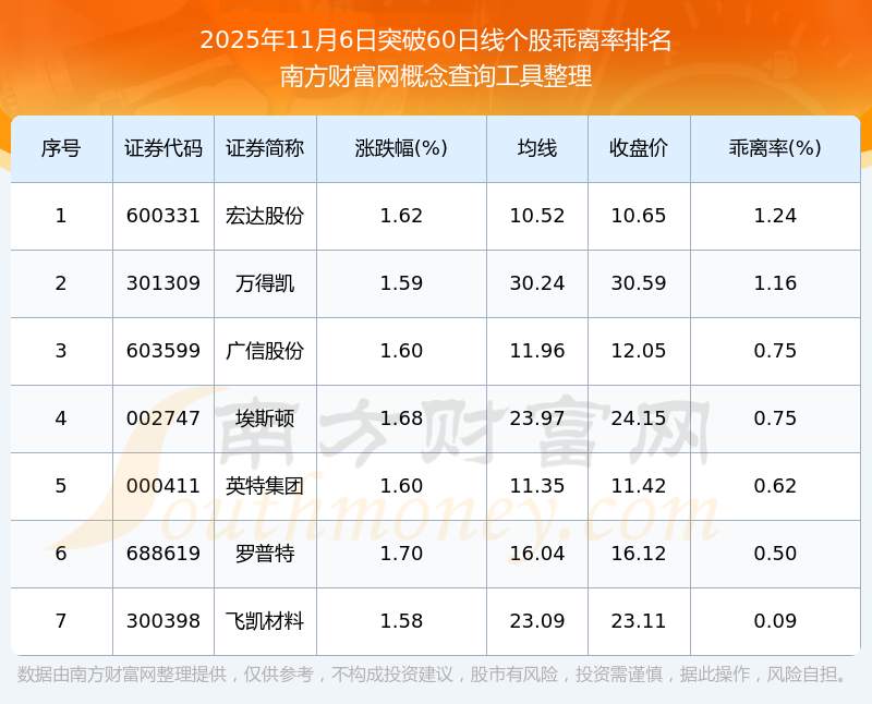 2025年11月6日突破60日線個(gè)股乖離率排名