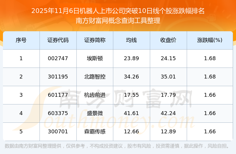根據南方財富網概念查詢工具數據統(tǒng)計,截止2025年11月6日收盤,機器人上市公司共有5只個股收盤價向上突破了10日線。其中漲幅較大的個股有埃斯頓、北路智控、杭齒前進等,漲幅分別為1.68%、1.68%、1.66%。