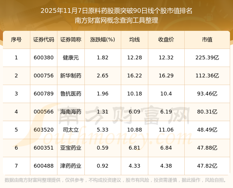 根據(jù)南方財富網(wǎng)概念查詢工具數(shù)據(jù)統(tǒng)計,截止2025年11月7日收盤,原料藥股票共有7只個股收盤價向上突破了90日線。其中市值較大的個股有健康元、新華制藥、魯抗醫(yī)藥等,市值分別為225.39億、112.36億、93.46億。