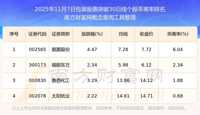 2025年11月7日包裝股票突破30日線個(gè)股乖離率排名