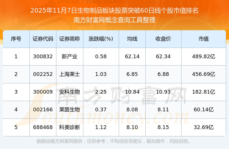 根據(jù)南方財富網(wǎng)概念查詢工具數(shù)據(jù)統(tǒng)計,截止2025年11月7日收盤,生物制品板塊股票共有5只個股收盤價向上突破了60日線。其中市值較大的個股有新產(chǎn)業(yè)、上海萊士、安科生物等,市值分別為489.82億、456.69億、182.81億。