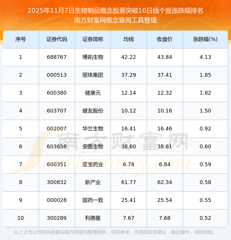 2025年11月7日生物制品概念股票突破10日線個股漲跌幅排名