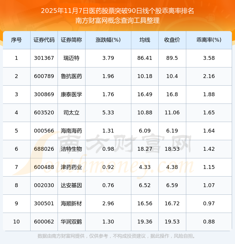2025年11月7日醫(yī)藥股票突破90日線個(gè)股乖離率排名