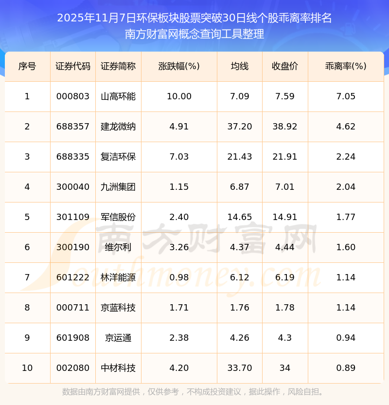2025年11月7日環(huán)保板塊股票突破30日線個(gè)股乖離率排名