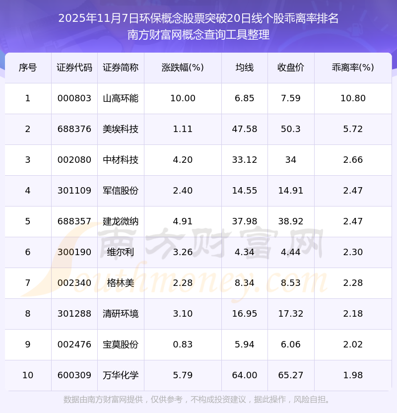 2025年11月7日環(huán)保概念股票突破20日線個(gè)股乖離率排名