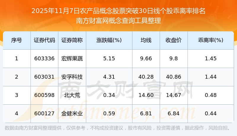 2025年11月7日農(nóng)產(chǎn)品概念股票突破30日線個(gè)股乖離率排名
