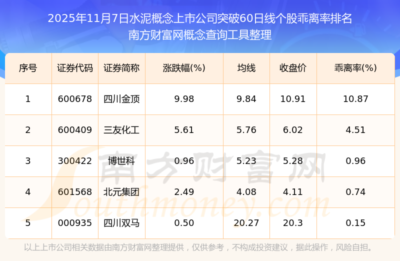 2025年11月7日水泥概念上市公司突破60日線個(gè)股乖離率排名