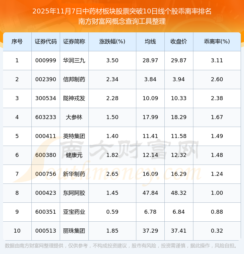 2025年11月7日中藥材板塊股票突破10日線個股乖離率排名