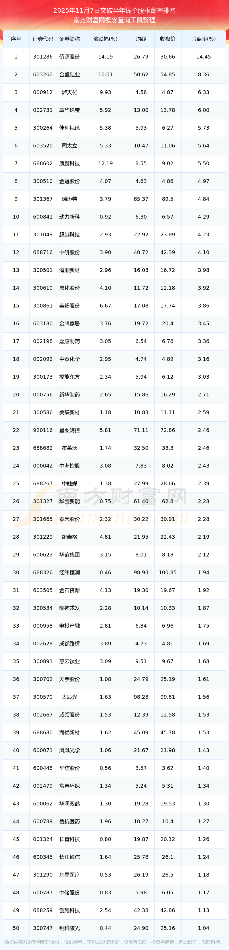 2025年11月7日突破半年線個(gè)股乖離率排名