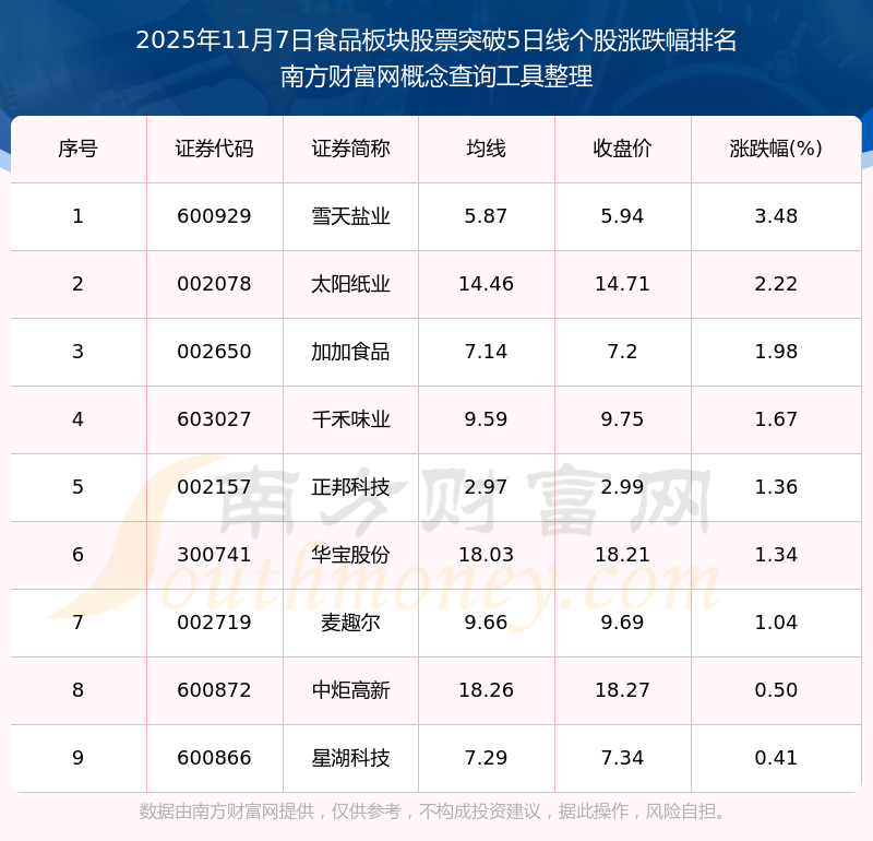 2025年11月7日食品板塊股票突破5日線個(gè)股漲跌幅排名