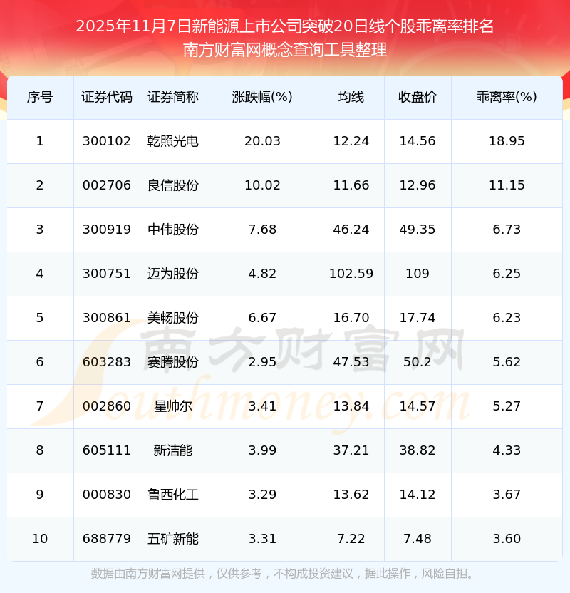 2025年11月7日新能源上市公司突破20日線個股乖離率排名
