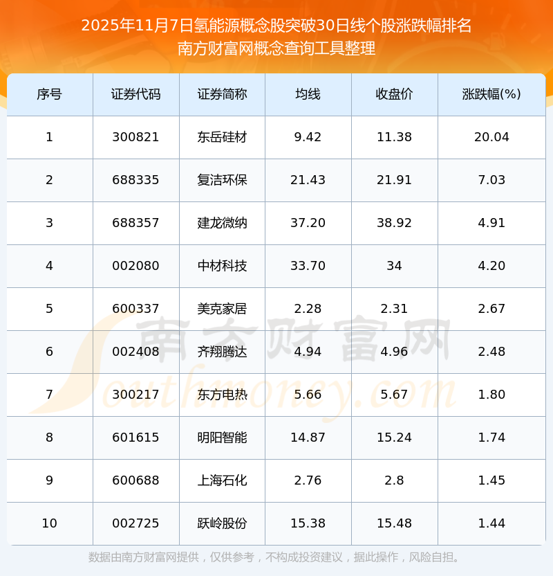 2025年11月7日氫能源概念股突破30日線個(gè)股漲跌幅排名