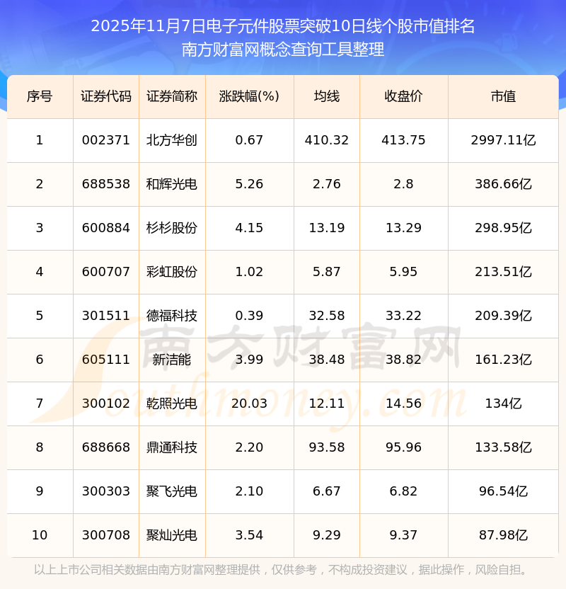 2025年11月7日電子元件股票突破10日線個(gè)股市值排名