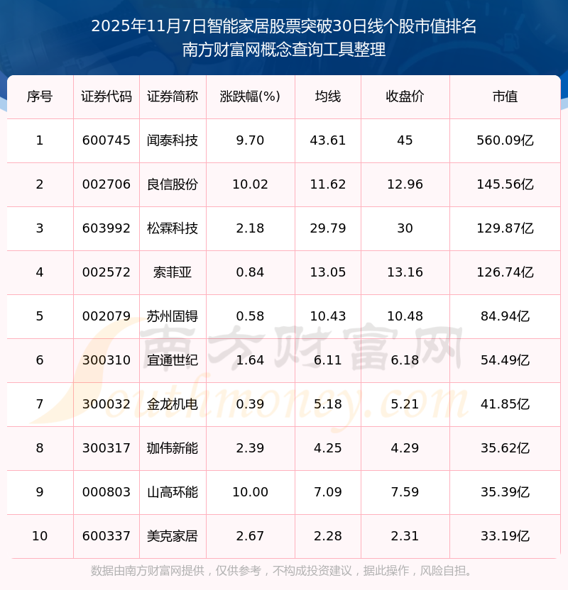 2025年11月7日智能家居股票突破30日線個(gè)股市值排名