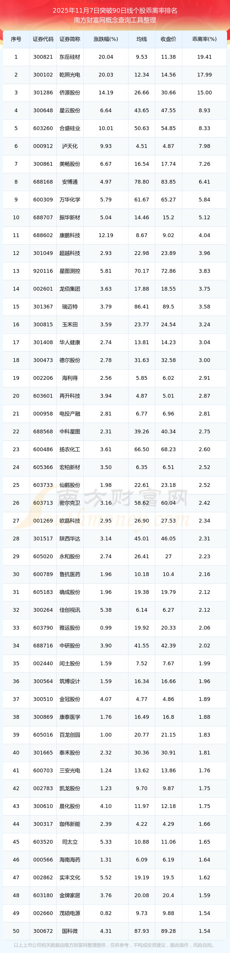 根據(jù)南方財(cái)富網(wǎng)概念查詢工具數(shù)據(jù)統(tǒng)計(jì),截止2025年11月7日收盤,共有130只個(gè)股收盤價(jià)向上突破了90日線,其中乖離率較大的個(gè)股有東岳硅材、乾照光電、僑源股份、星云股份、合盛硅業(yè)等,乖離率分別為19.41%、17.99%、15.00%、8.93%、8.33%。