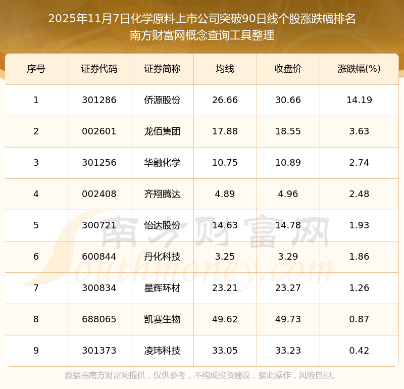 2025年11月7日化學(xué)原料上市公司突破90日線個(gè)股漲跌幅排名