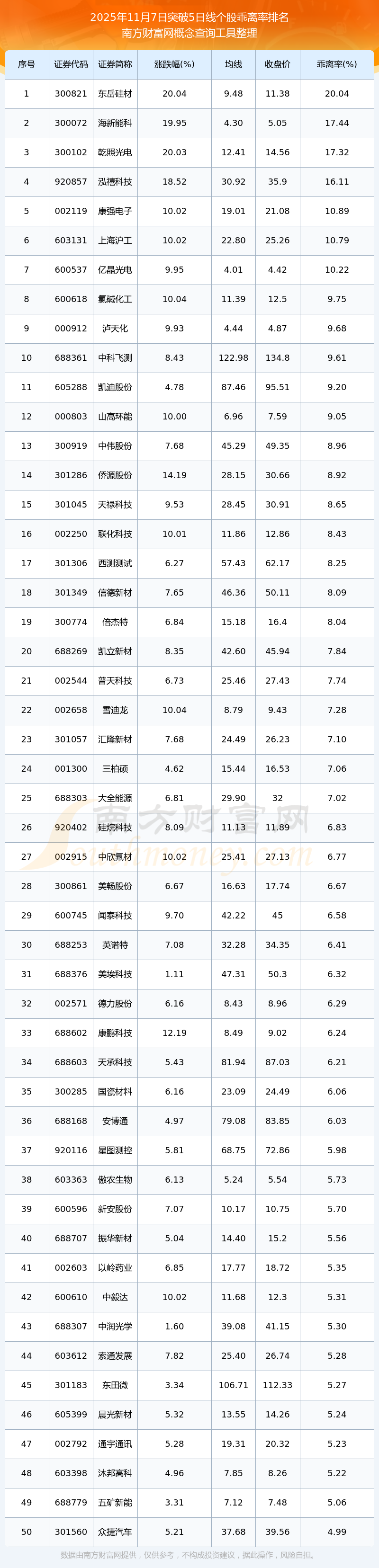 根據(jù)南方財富網(wǎng)概念查詢工具數(shù)據(jù)統(tǒng)計,截止2025年11月7日收盤,共有431只個股收盤價向上突破了5日線,其中乖離率較大的個股有東岳硅材、海新能科、乾照光電、泓禧科技、康強電子等,乖離率分別為20.04%、17.44%、17.32%、16.11%、10.89%。