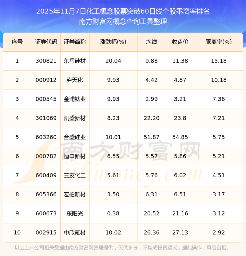 2025年11月7日化工概念股票突破60日線個(gè)股乖離率排名
