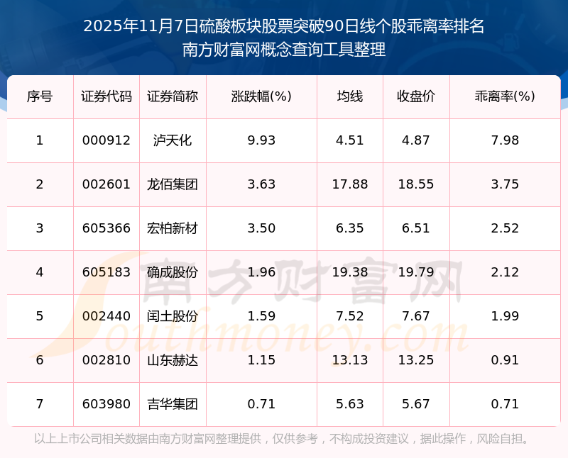 2025年11月7日硫酸板塊股票突破90日線個股乖離率排名