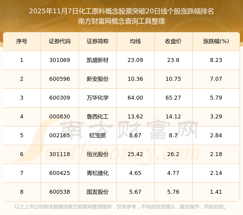 根據(jù)南方財富網(wǎng)概念查詢工具數(shù)據(jù)統(tǒng)計,截止2025年11月7日收盤,化工原料概念股票共有8只個股收盤價向上突破了20日線。其中漲幅較大的個股有凱盛新材、新安股份、萬華化學(xué)等,漲幅分別為8.23%、7.07%、5.79%。