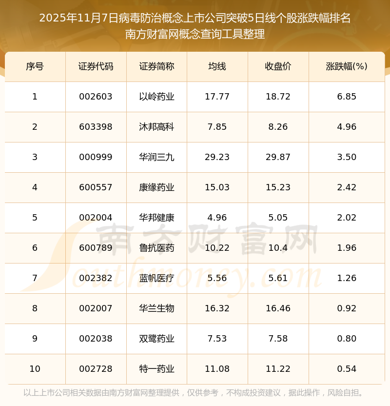 根據(jù)南方財(cái)富網(wǎng)概念查詢工具數(shù)據(jù)統(tǒng)計(jì),截止2025年11月7日收盤,病毒防治概念上市公司共有13只個(gè)股收盤價(jià)向上突破了5日線。其中漲幅較大的個(gè)股有以嶺藥業(yè)、沐邦高科、華潤(rùn)三九等,漲幅分別為6.85%、4.96%、3.50%。