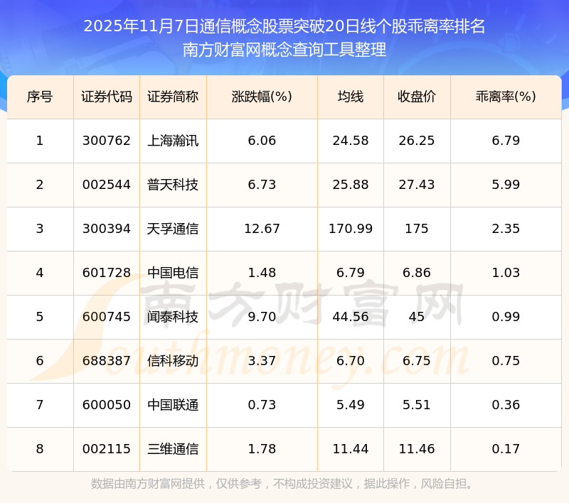 2025年11月7日通信概念股票突破20日線個股乖離率排名