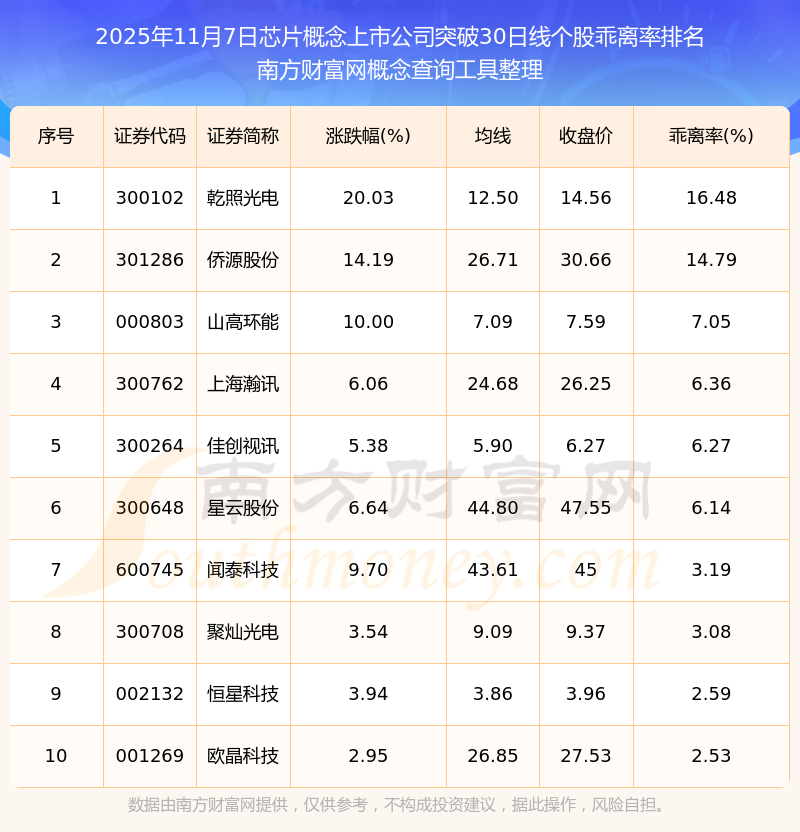 2025年11月7日芯片概念上市公司突破30日線個股乖離率排名