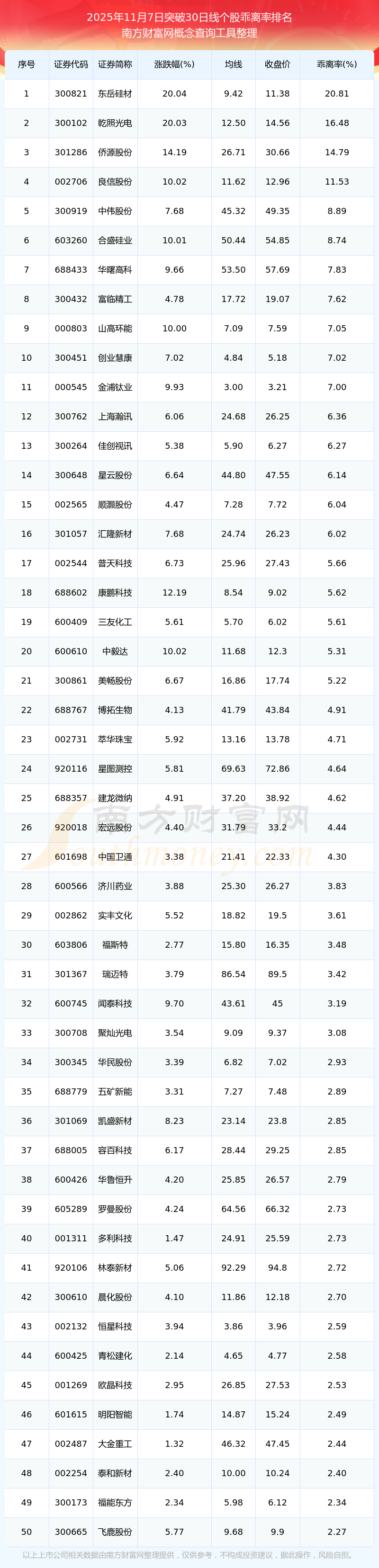 根據(jù)南方財富網(wǎng)概念查詢工具數(shù)據(jù)統(tǒng)計,截止2025年11月7日收盤,共有208只個股收盤價向上突破了30日線,其中乖離率較大的個股有東岳硅材、乾照光電、僑源股份、良信股份、中偉股份等,乖離率分別為20.81%、16.48%、14.79%、11.53%、8.89%。