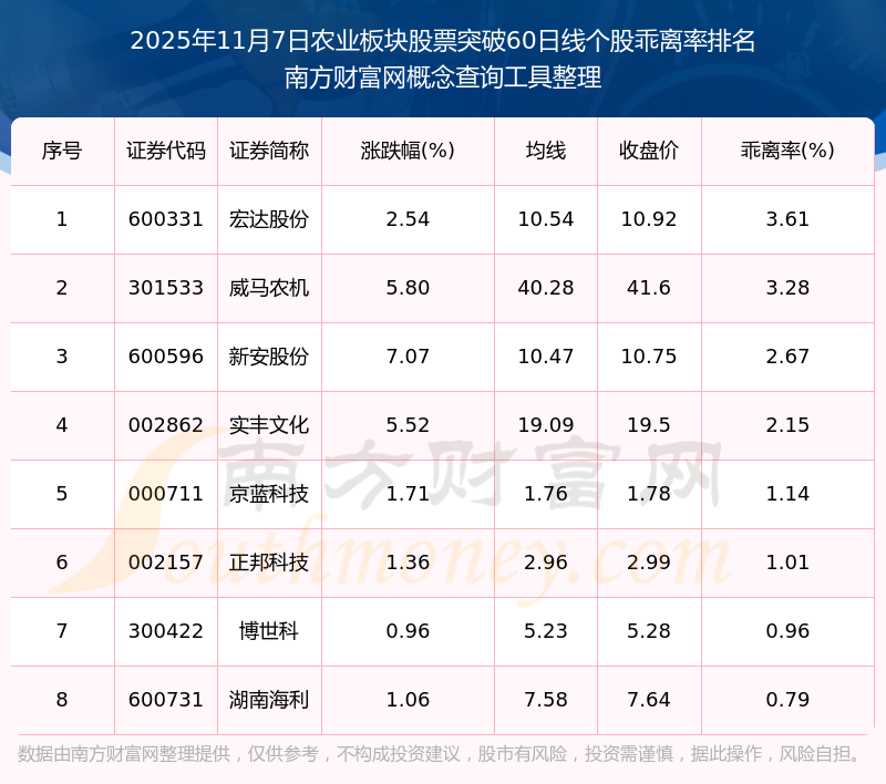 2025年11月7日農(nóng)業(yè)板塊股票突破60日線個股乖離率排名