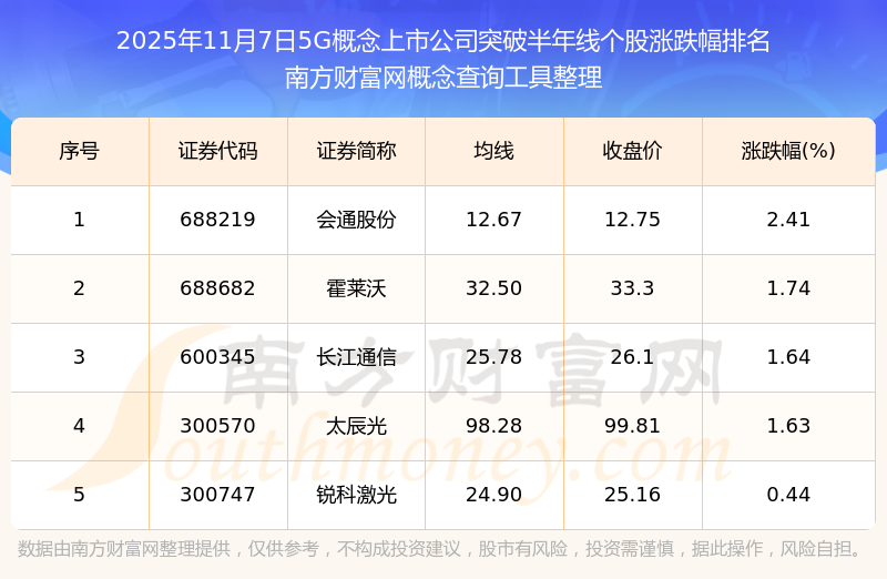 根據(jù)南方財富網(wǎng)概念查詢工具數(shù)據(jù)統(tǒng)計,截止2025年11月7日收盤,5G概念上市公司共有5只個股收盤價向上突破了半年線。其中漲幅較大的個股有會通股份、霍萊沃、長江通信等,漲幅分別為2.41%、1.74%、1.64%。