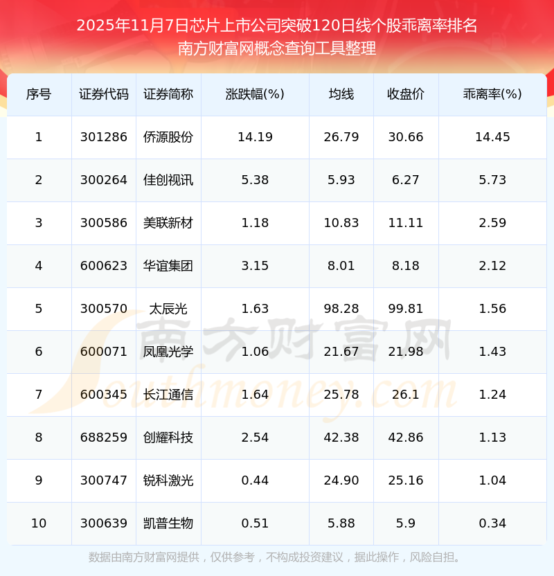 2025年11月7日芯片上市公司突破120日線個(gè)股乖離率排名