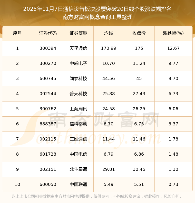 2025年11月7日通信設(shè)備板塊股票突破20日線個股漲跌幅排名