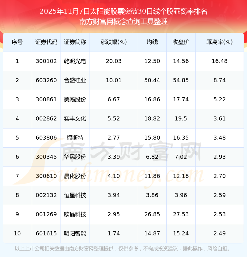 2025年11月7日太陽(yáng)能股票突破30日線個(gè)股乖離率排名