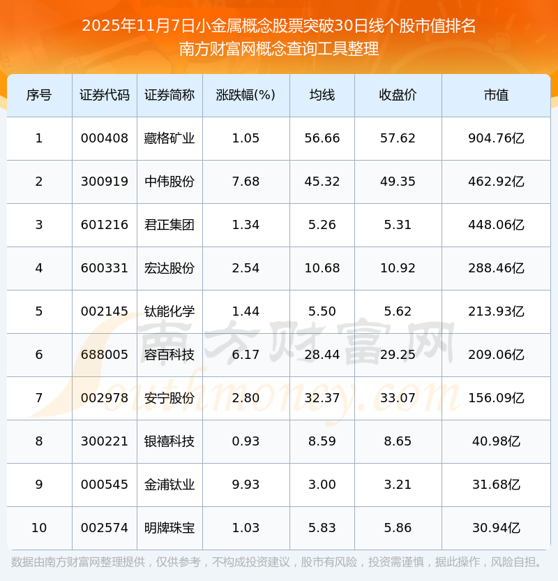 2025年11月7日小金屬概念股票突破30日線個(gè)股市值排名