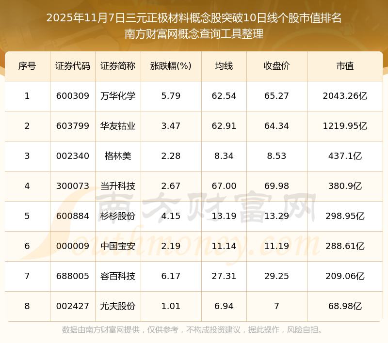 2025年11月7日三元正極材料概念股突破10日線個股市值排名