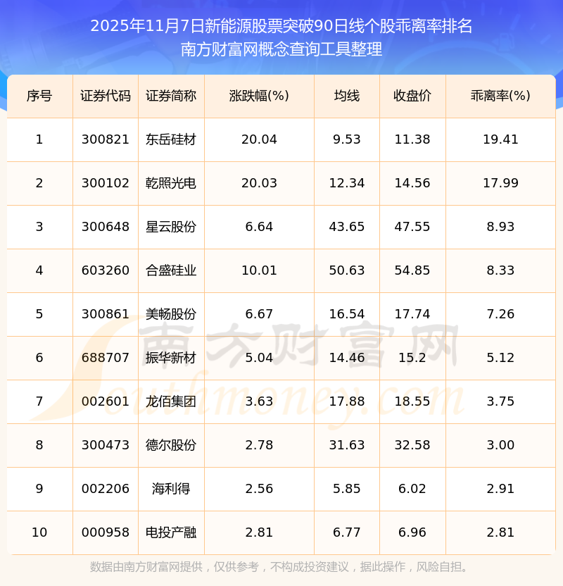 根據(jù)南方財(cái)富網(wǎng)概念查詢工具數(shù)據(jù)統(tǒng)計(jì),截止2025年11月7日收盤,新能源股票共有25只個股收盤價(jià)向上突破了90日線。其中乖離率較大的個股有東岳硅材、乾照光電、星云股份等,乖離率分別為19.41%、17.99%、8.93%。