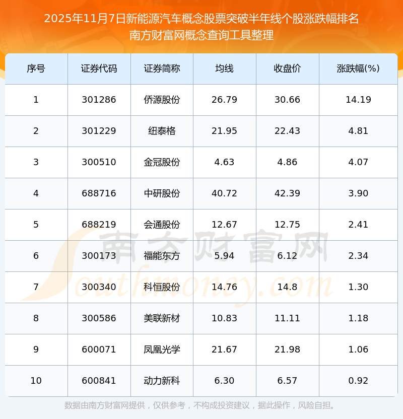 根據(jù)南方財(cái)富網(wǎng)概念查詢工具數(shù)據(jù)統(tǒng)計(jì),截止2025年11月7日收盤,新能源汽車概念股票共有14只個(gè)股收盤價(jià)向上突破了半年線。其中漲幅較大的個(gè)股有僑源股份、紐泰格、金冠股份等,漲幅分別為14.19%、4.81%、4.07%。
