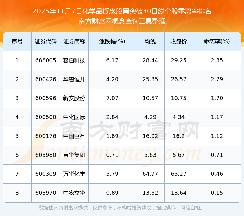 2025年11月7日化學(xué)品概念股票突破30日線個股乖離率排名