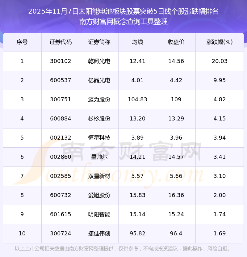 2025年11月7日太陽能電池板塊股票突破5日線個股漲跌幅排名
