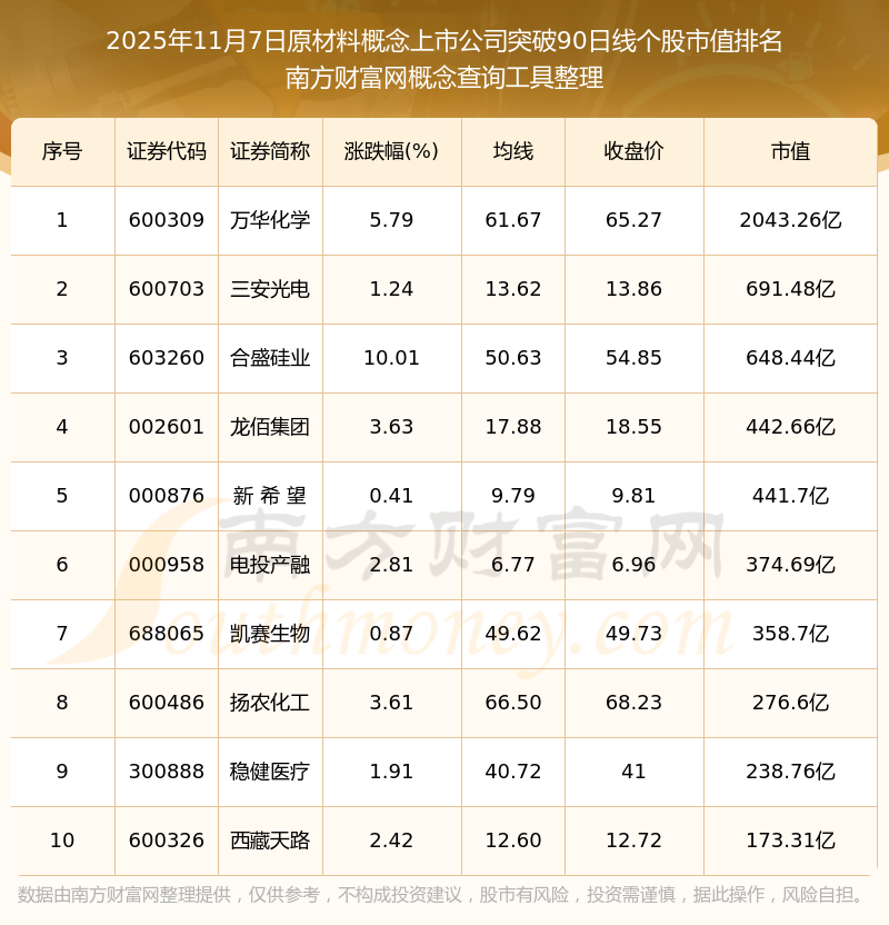 2025年11月7日原材料概念上市公司突破90日線(xiàn)個(gè)股市值排名
