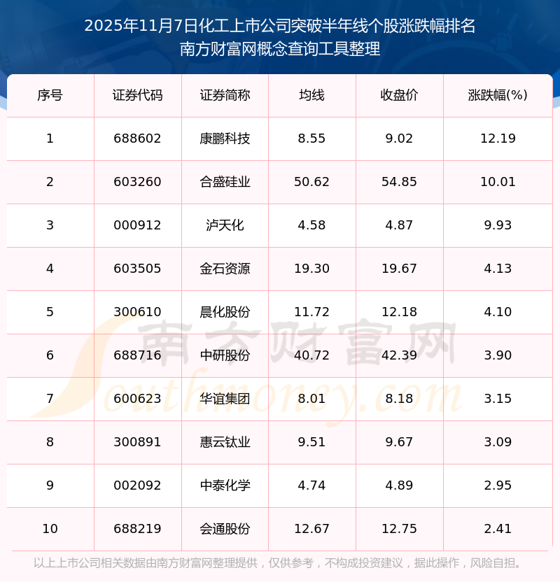 根據(jù)南方財(cái)富網(wǎng)概念查詢(xún)工具數(shù)據(jù)統(tǒng)計(jì),截止2025年11月7日收盤(pán),化工上市公司共有15只個(gè)股收盤(pán)價(jià)向上突破了半年線(xiàn)。其中漲幅較大的個(gè)股有康鵬科技、合盛硅業(yè)、瀘天化等,漲幅分別為12.19%、10.01%、9.93%。
