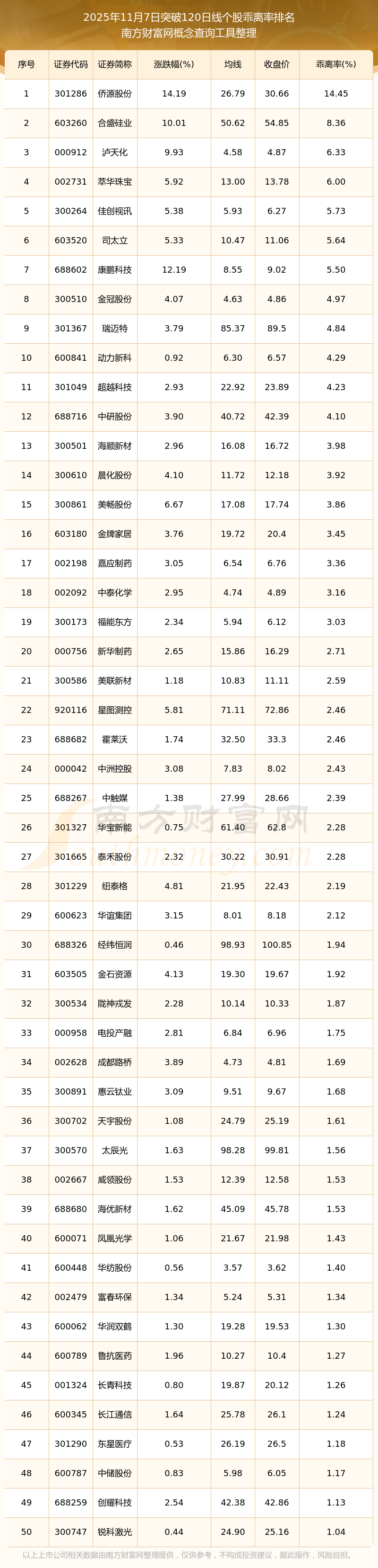 根據(jù)南方財富網(wǎng)概念查詢工具數(shù)據(jù)統(tǒng)計,截止2025年11月7日收盤,共有86只個股收盤價向上突破了120日線,其中乖離率較大的個股有僑源股份、合盛硅業(yè)、瀘天化、萃華珠寶、佳創(chuàng)視訊等,乖離率分別為14.45%、8.36%、6.33%、6.00%、5.73%。