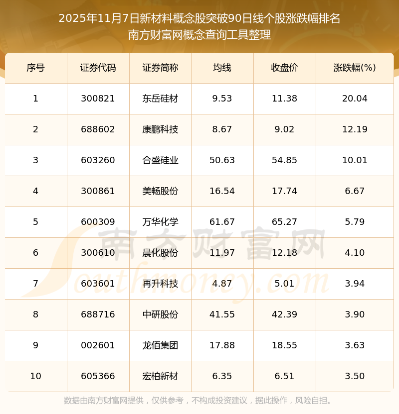 根據(jù)南方財富網(wǎng)概念查詢工具數(shù)據(jù)統(tǒng)計,截止2025年11月7日收盤,新材料概念股共有22只個股收盤價向上突破了90日線。其中漲幅較大的個股有東岳硅材、康鵬科技、合盛硅業(yè)等,漲幅分別為20.04%、12.19%、10.01%。