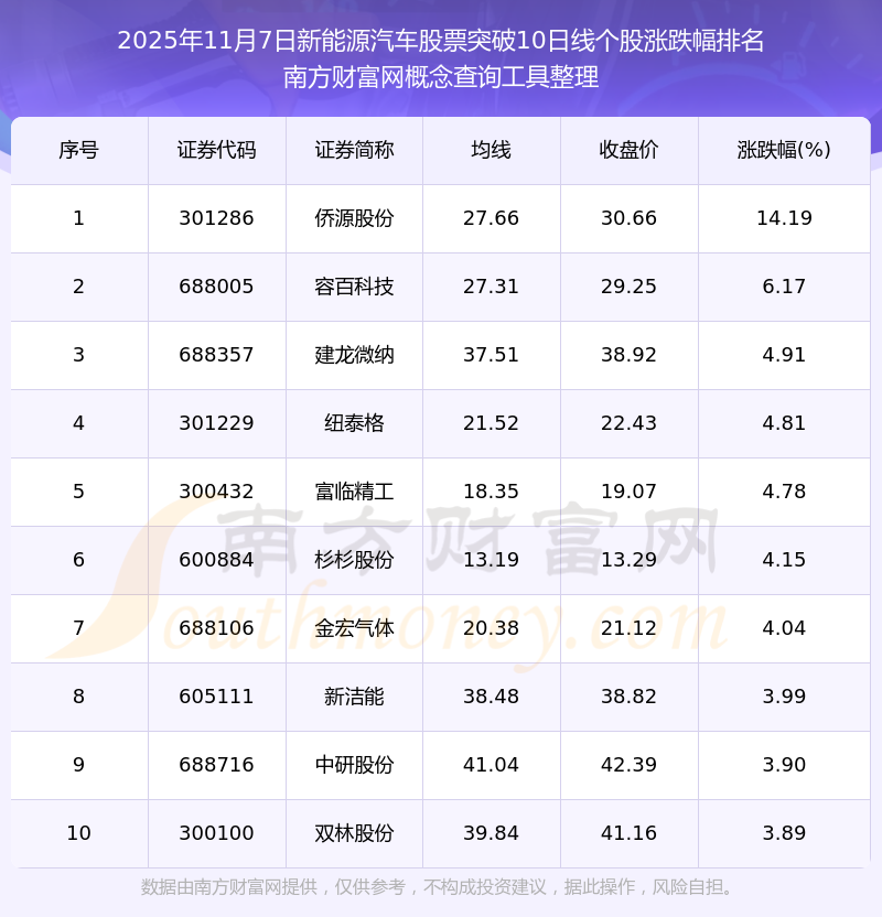 2025年11月7日新能源汽車股票突破10日線個股漲跌幅排名