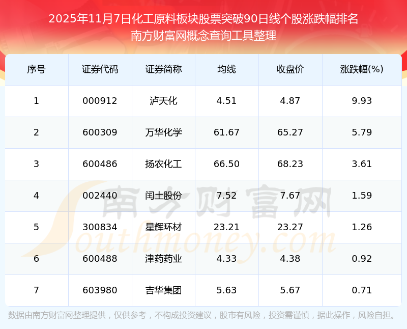 根據(jù)南方財富網(wǎng)概念查詢工具數(shù)據(jù)統(tǒng)計,截止2025年11月7日收盤,化工原料板塊股票共有7只個股收盤價向上突破了90日線。其中漲幅較大的個股有瀘天化、萬華化學(xué)、揚農(nóng)化工等,漲幅分別為9.93%、5.79%、3.61%。