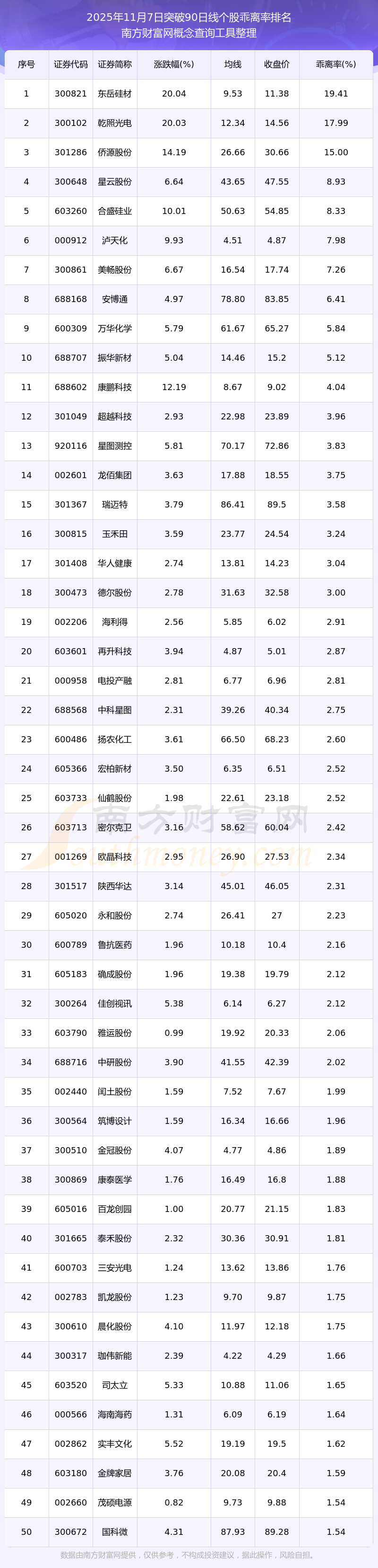2025年11月7日突破90日線個(gè)股乖離率排名