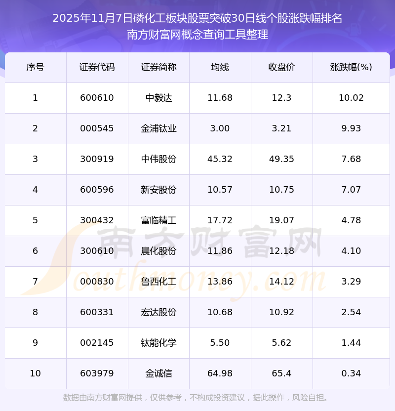 2025年11月7日磷化工板塊股票突破30日線個股漲跌幅排名
