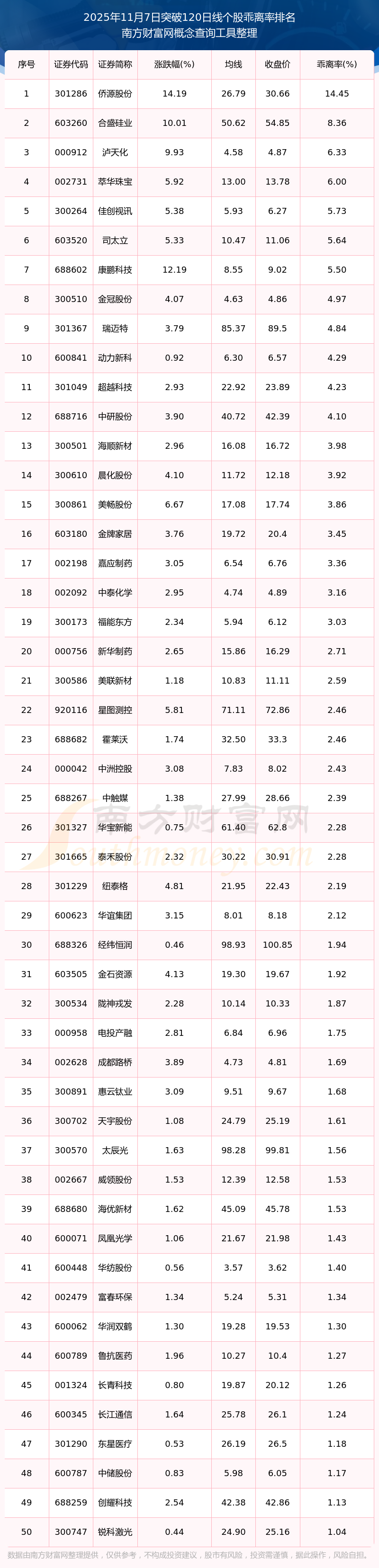 2025年11月7日突破半年線個(gè)股乖離率排名