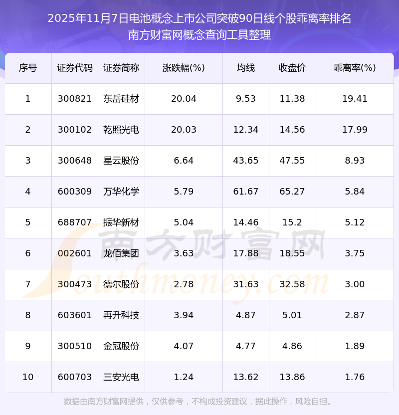 根據(jù)南方財富網概念查詢工具數(shù)據(jù)統(tǒng)計,截止2025年11月7日收盤,電池概念上市公司共有21只個股收盤價向上突破了90日線。其中乖離率較大的個股有東岳硅材、乾照光電、星云股份等,乖離率分別為19.41%、17.99%、8.93%。
