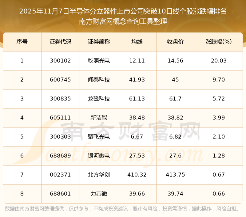 2025年11月7日半導(dǎo)體分立器件上市公司突破10日線個(gè)股漲跌幅排名